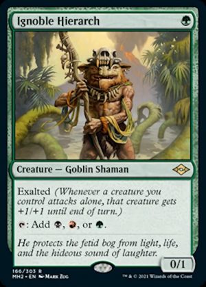 Ignoble Hierarch is a goblin - which anyone who has consistently read my articles knows is my absolute favorite tribe in Magic. I play goblins in every format, and this fun-hating little shaman is going to be tested in all of the ones it's legal in. Not only does this check the box of my ultimate love in Magic, it checks another one of my favorite boxes: it's playable in Modern Infect (which, as I've mentioned before was my first Modern deck and still my favorite pet deck in the format.) This might be the piece that brings the BG Infect lists back into the limelight! People are going to be seriously testing red pump spells! At the very least, I feel like this is Noble Hierarch number five (or six) in the UG infect lists that were running Birds of Paradise in that slot.