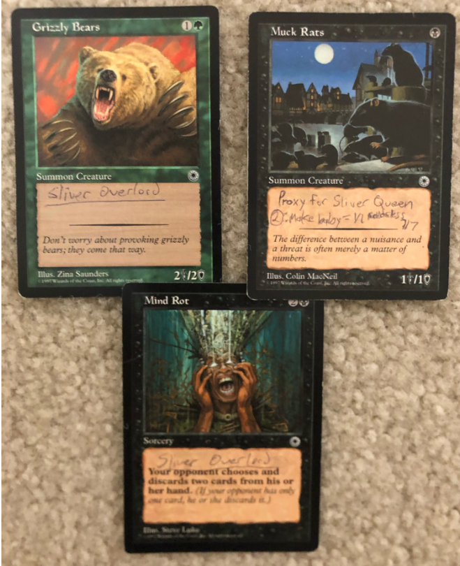 But the worst problem of all: Portal cards weren’t tournament legal when they were released. Granted, my friends and I never actually played in any tournaments back then so it really didn’t matter. But the decree made the cards feel “lesser” as a result, and they were relegated to our bulk boxes or, worst yet, used for proxies (the picture below are actual proxies from my friend’s Slivers deck, made about 15 years ago).