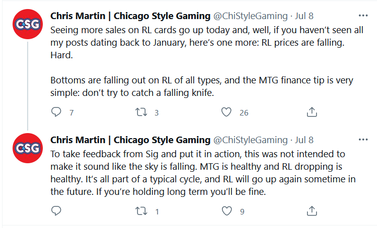 You can see in his reply that I challenged Chris on his choice of words in the original tweet. I was expecting prices to drop further too, but I felt his rhetoric was a touch too bearish. He responded well to the feedback, and we both agreed that the sell-off was completely healthy for the game and its financial component.