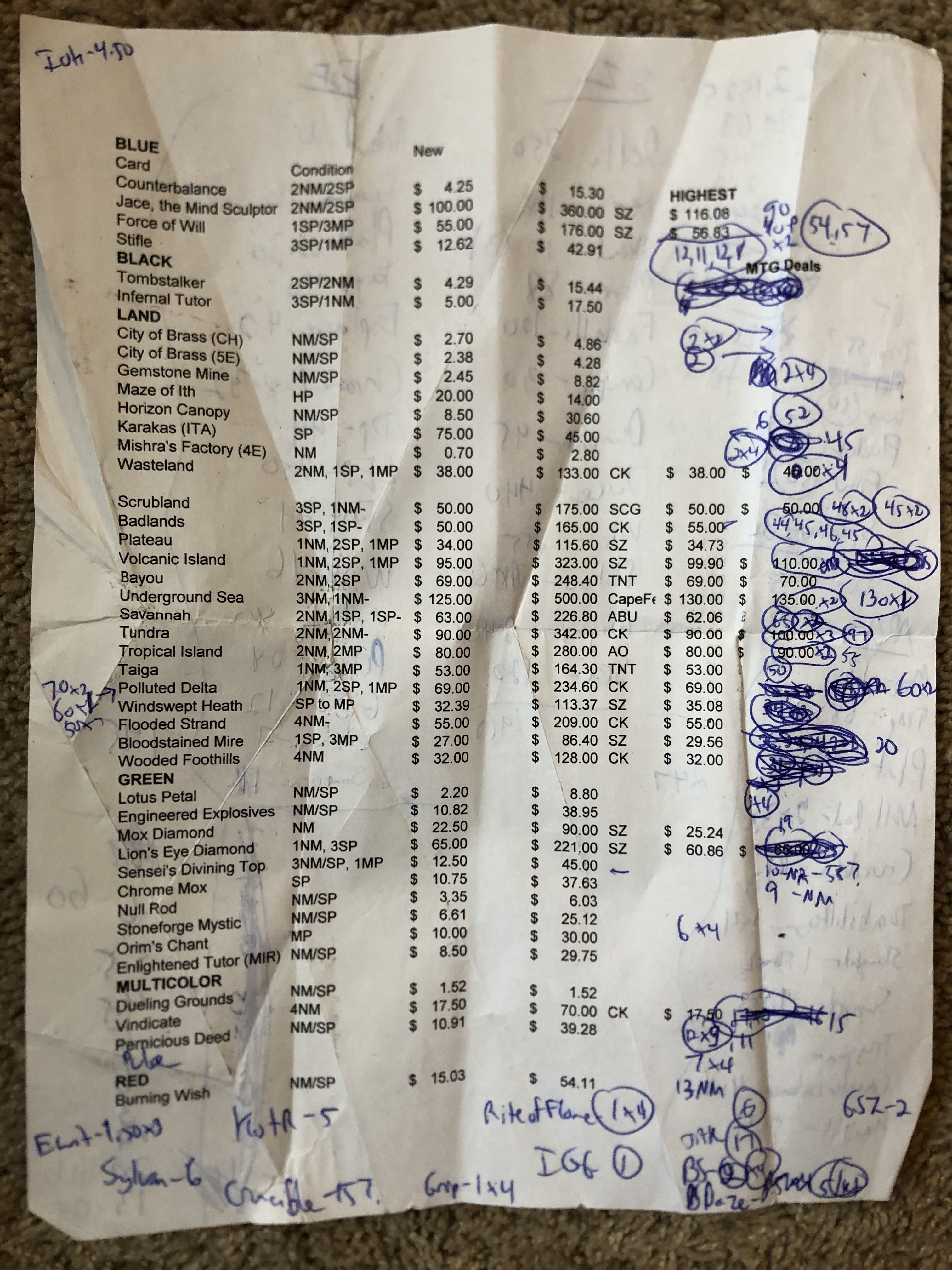 The spreadsheet printout became quite messy as I went from vendor to vendor, adjusting my expectations and tailoring prices accordingly (the sheet of paper also sat in the bottom of my backpack for years). But at the end of the day I accomplished my goalāmy Legacy collection was gone and in its place, I had the start of a college fund.
