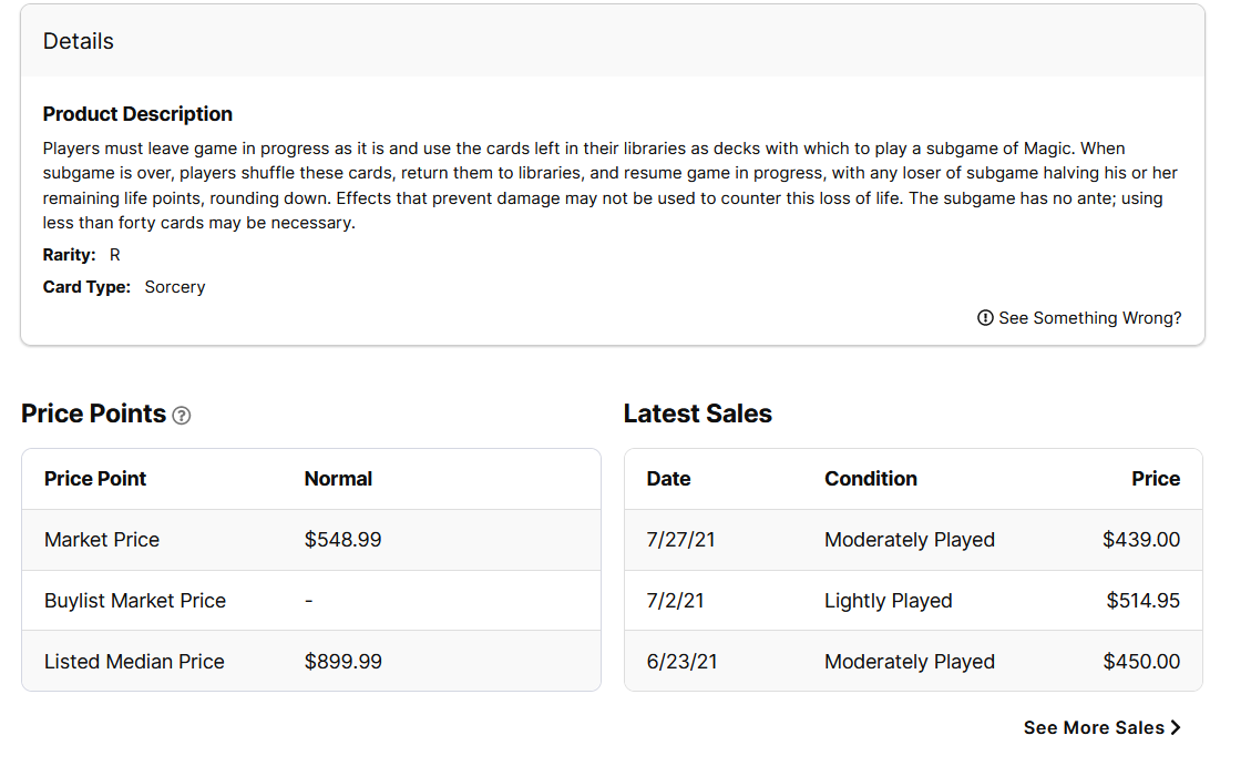 That $499.00 market price was probably correct a year ago, but today it is way off. Ironically, the listed median price is much closer to the cardâs true current valueâCard Kingdom pays $1260 for near mint copies on their buylist, more than double âmarket priceâ. If you look at the âLatest Salesâ section, you can see why the market price is so far off. There is no data there, probably because a copy of this card hasnât sold on TCGplayer in quite a while.