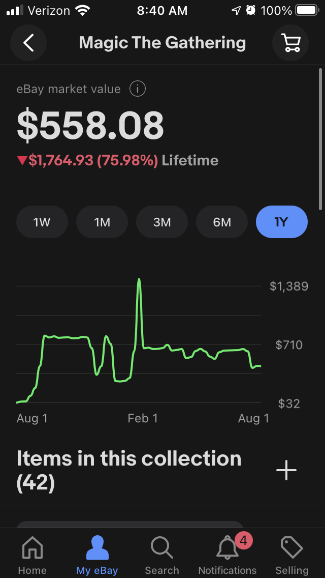 It looks like eBay is pulling pricing for cards I purchased from the site over some period of time. I think itâs been over a year since I bought the cards pictured though, so Iâm not sure how far back the site is going. Whatâs more, of course, the site doesnât automatically remove cards from inventory if I sell them on a different platform, so the collection would have to be manually maintained.
