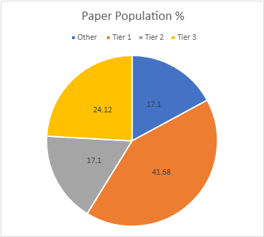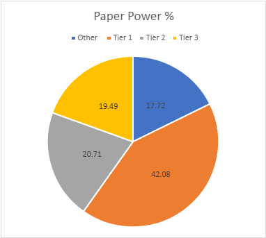 26 decks made the tier list, which is above average for paper. The adjusted average population is 6.04, so 6 results make the list. The adjusted STDev is 9.60, so the increment is 10. Therefore, Tier 3 runs from 6 to 16, Tier 2 is 17 to 27 and Tier 1 is 28 and over.