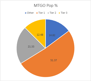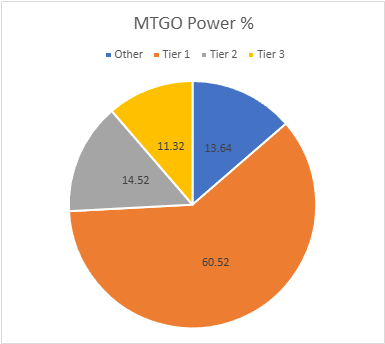 The MTGO data nearly exclusively comes from official Preliminary, Qualifiers, and Challenge results. Leagues are excluded, as they add analytically useless bulk data to both the population and power tiers. The paper data comes from any source I can find, with all reported events being counted.