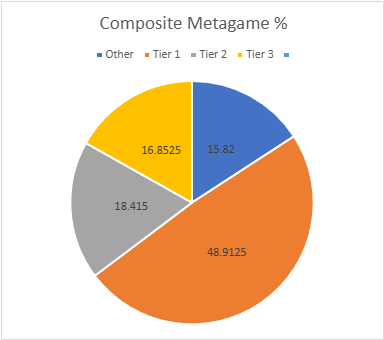 Then we go one standard deviation (STdev) above average to set the limit of Tier 3 and the cutoff for Tier 2. This mathematically defines Tier 3 as those decks clustered near the average. Tier 2 goes from the cutoff to the next standard deviation. These are decks that perform well above average. Tier 1 consists of those decks at least two standard deviations above the mean result, encompassing the truly exceptional performing decks.