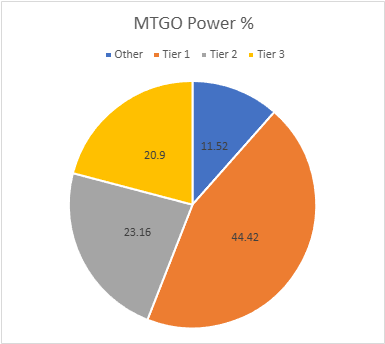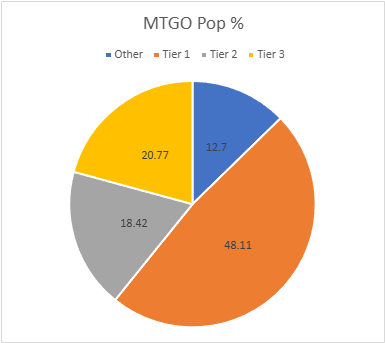The MTGO data nearly exclusively comes from official Preliminary, Qualifiers, and Challenge results. Leagues are excluded, as they add analytically useless bulk data to both the population and power tiers. The paper data comes from any source I can find, with all reported events being counted.