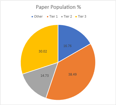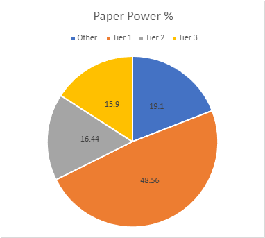 25 decks made the tier list, which is roughly average for paper. The average population is 6.79, so 7 results make the list. The adjusted STDev is 11.05, so the increment is 11. Therefore, Tier 3 runs from 7 to 18, Tier 2 is 19 to 30 and Tier 1 is 31 and over.