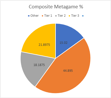 Then we go one standard deviation (STdev) above average to set the limit of Tier 3 and the cutoff for Tier 2. This mathematically defines Tier 3 as those decks clustered near the average. Tier 2 goes from the cutoff to the next standard deviation. These are decks that perform well above average. Tier 1 consists of those decks at least two standard deviations above the mean result, encompassing the truly exceptional performing decks.