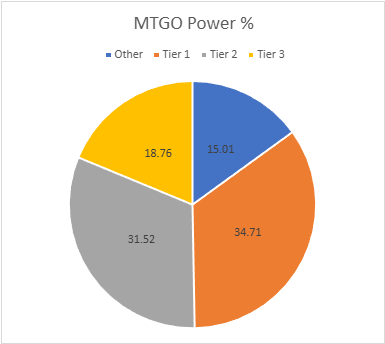 The MTGO data nearly exclusively comes from official Preliminary, Qualifiers, and Challenge results. Leagues are excluded, as they add analytically useless bulk data to both the population and power tiers. The paper data comes from any source I can find, with all reported events being counted.