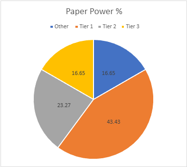 16 decks made the tier list, which is below average for paper, but is also explainable by the lack of outliers. No outliers=fewer decks make the Tier List. The average population is exactly 12 so that's where the Lis starts. The STDev is 22.48, so the increment is 23. Therefore, Tier 3 runs from 12 to 35, Tier 2 is 36 to 59 and Tier 1 is 60 and over.