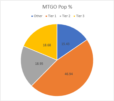 October's unadjusted average population for MTGO is 21.04. I always round down if the decimal is less than .20. Tier 3, therefore, begins with decks posting 21 results. The unadjusted STdev was 36.02, so add 36 and that means Tier 3 runs to 57 results. Again, it's the starting point to the cutoff, then the next whole number for the next Tier. Therefore Tier 2 starts with 58 results and runs to 94. Subsequently, to make Tier 1, 95 decks are required.
