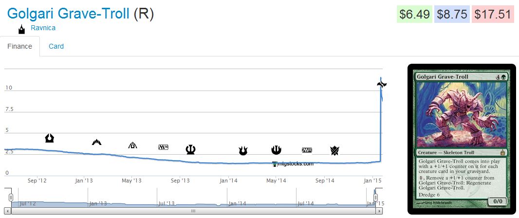 The inflation of Golgari Grave-Troll and dredge-related cards such as Vengevine, Gravecrawler, Bloodghast and Bridge From Below are the least likely to sustain in my opinion. Although the potential decks gravitating around the troll may have a shot, DredgeVine decks only saw fringe appearances in Modern before Khans of Tarkir. Anti-graveyard cards, reinforced by Anafenza, the Foremost, are still a big hurdle for heavy graveyard-based strategies.