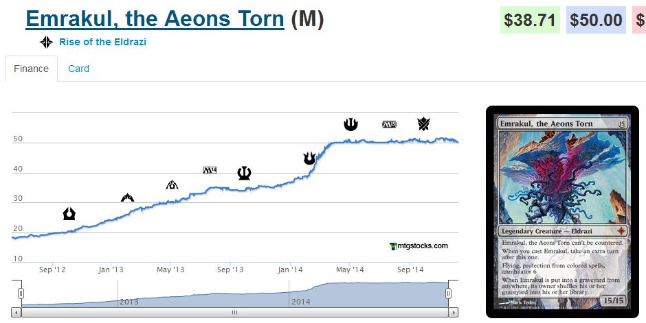 Emrakul was a $50 card prior to this announcement. Even though it’s being printed at Mythic Rare in MM2015, I still believe the best action here is to sell excess copies.
