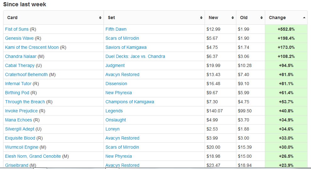 Fist of Suns spiked hard. Paul Feudo wrote about the deck on Friday morning and $2 was a good buy-in point, but by Saturday these were $10.
