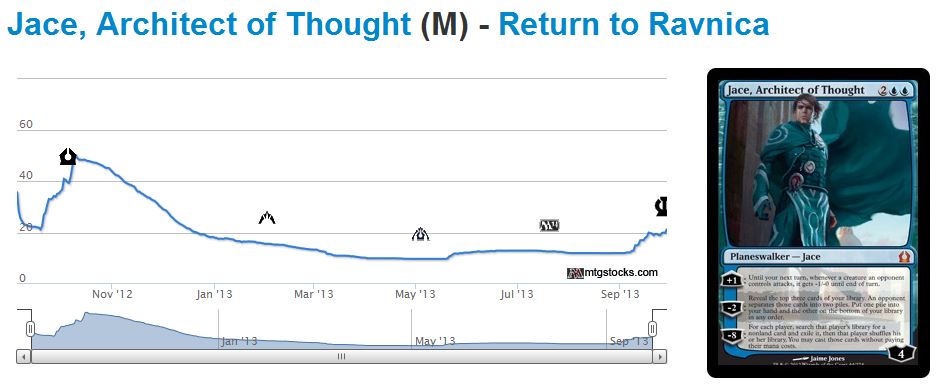 How about that Jace, Architect of Thought? Ryan Bushard called those like nine months ago and has been building a big pile out of them since then. He was overpaying back in the day, but it won't matter now that they're $30. Is $30 the ceiling? Not historically!