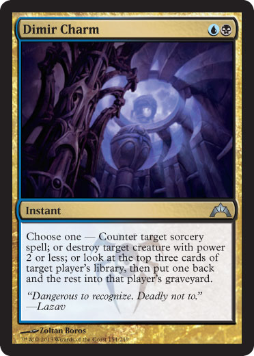 I'm not sure what the actual charm is in the artwork for this card. It looks more like a building. Nonetheless, I do like the flavor contained within the card's abilities. Each spell seems like it could be situationally very strong. If you're winning, ding your opponent by letting him draw a blank. If you're losing, you can destroy his Deathrite Shaman or other utility creature. If you need to dig for answers, take the best of three cards off the top of your deck. If there are any Sorceries worth countering, you could always do that too (Bonfire of the Damned, Terminus, etc.). Still, I don't see the Uncommon being too ubiquitous nor do I see it exceeding a buck in trade.