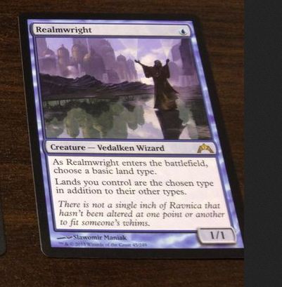 Hello super mana fixer!!! Could this card be playable as a backup plan in Modern Valakut decks? If every land you have in play is a mountain, then every other mountain you play will trigger Valakut. Even Valakut would count as a Mountain! Being on a delicate 1/1 body is sub-optimal, but Urborg, Tomb of Yawgmoth fetches decent coin for making all lands swamps. Though this one only affects your lands - not sure if that's better or worse. This guy just might be worth keeping an eye on. Notice I said keeping an eye on but not preordering. At $2.49 the upside is gone unless the card breaks into Standard. If this was $0.99 I may have actually thought about ordering a set.
