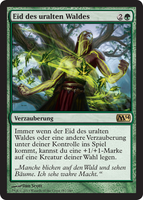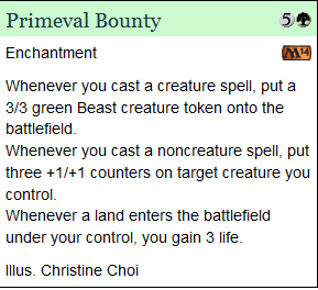 So the more I read this, the more absurd it seems. It's obviously a bomb in limited, but could it get there in contructed? Having every instant spell double as a permanent Giant Growth seems useful against red strategies and free-wheeling dudes seems great. Even making an ordinary land drop is fun with Bounty in play. If it sees play at all it will likely go over $5 and since this will likely start out at bulk in trades, it's very low risk. If anyone breaks this it will take a while so you can accumulate these. This is obviously nutso in EDH, so snag cheap foils if foils of this don't just start out expensive. Lots of opportunity with a card this powerful because not every format is fast.