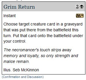 Grim Return is like a Standard Reanimate, but it's much weaker. Since the creature has go to enter the graveyard from the battlefield, the opportunity to be broken is not there. No chance to discard a creature and then Reanimate it. My guess is that this card doesn't see play in constructed formats.