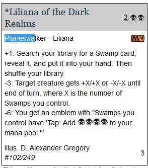 I was almost convinced to invest in a few Lilianas a few months ago when all this talk about Mutilate and swamps was going on in the forums. Glad I didn't. These reprinted Planeswalkers are only going to drop in price now. It's also worth noting that Liliana of the Veil may go up in price in time (after initial dip at rotation) since she's likely not going to be reprinted.