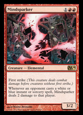 So clearly Witchstalker is the elephant in the room and the card amongst this cycle getting all the attention, but I feel like you ignore Mindsparker at your peril. I don't know if 3/2 first strike for 1RR makes him good enough to maindeck or not- I'm not an actual wizard. What I can tell you is that this can wreak some legitimate havoc against control opponents. There seem to be all the elements for a mono red deck that punishes other colors for having greedy manabases possible, and this seems like it will help. Imagine your opponent taking five damage to cast a Supreme Verdict with Mindsparker and Burning Earth. Want to play a Think Twice? Go ahead. Flash it back while you're at it. Being hexproof is obviously better which makes Witchstalker appealing to a lot of players, but this guy is a monster in combat, will likely shock them at least twice before they deal with it unless they do so right away and he doesn't have to attack to deal them damage the way Witchstalker does.