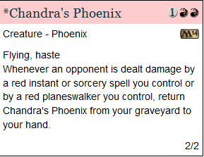 This efficient creature was the lynchpin of aggressive, red-based strategies. Utilizing the quick clock and resilience of the phoenix and the versatility of red direct damage, this card will be a player in standard coupled with a few weeks of Searing Spear and then doing its damage coupled with the spell in M14 printed to support it.