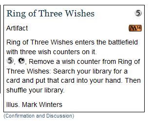 This card has some excellent flavor, and it should remain popular with the casual crowd. Talk about power creep - this card is much more powerful than the original Ring of Three Wishes. It seems genies have become more powerful these days. Still, any value on this ring will be driven by casual play, as the card is way too slow even for Standard. Picking up copies on the cheap once M14 is released could pay out in the long run because EDH players love searching their library for cards to put into their hand.