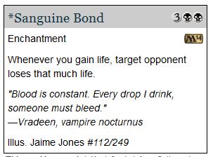 It's like the name of the game is reprint as many casual cards as you can to drop card prices! I remember when I discovered that this card was worth around $10...I was in utter shock. I had never once seen the card played in any format, yet there it was buy-listing in the high single digits. Well, that's all about to change. This reprint is easily going to half the value of this card while in Standard. Could Sanguine Bond increase again in the long term? Sure. Will this card be worth over $10 in 2013 or 2014? I highly doubt it.