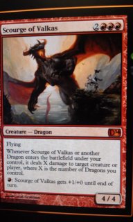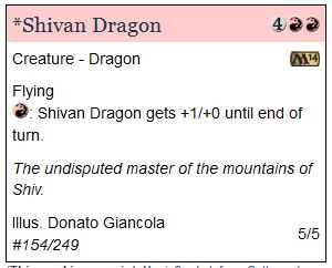 Being a 5 mana 4/4 flying dragon didn't really get me too excited. Thundermaw Hellkite is just better. I started to read this guy's ability and I was almost excited. Then I got to the part where it says it does damage equal to the number of DRAGON'S you control. What? I can see it dealing damage equal to its power or something like that, but how many Dragons are playable in Standard nowadays? I'm sure someone is going to love this in their casual Dragons deck, but that won't merit buying into this guy until he bottoms out in price.