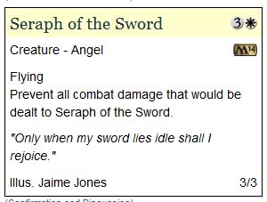 Being an Angel fan, I naturally have an obligation to mention this card. She doesn't quite have protection from creatures, but being a 3/3 flier that also acts as a Wall of Vapor is noteworthy. I'm not sure if this rare Angel will ever get there in Standard, but she can provide infinite blocking and some offense in the air on some occasion. I'm not preordering this one but I'm definitely keeping my eye on it. I need her for my Angel collection anyway!