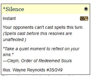 Just when this card was finally creeping out of bulk bins and into people's binder, it gets reprinted. I couldn't move these to dealers for a quarter a while back, but lately these have bumped up in price to being worth a couple bucks. So much for that - this reprint will pretty much cap Silence's growth right here.