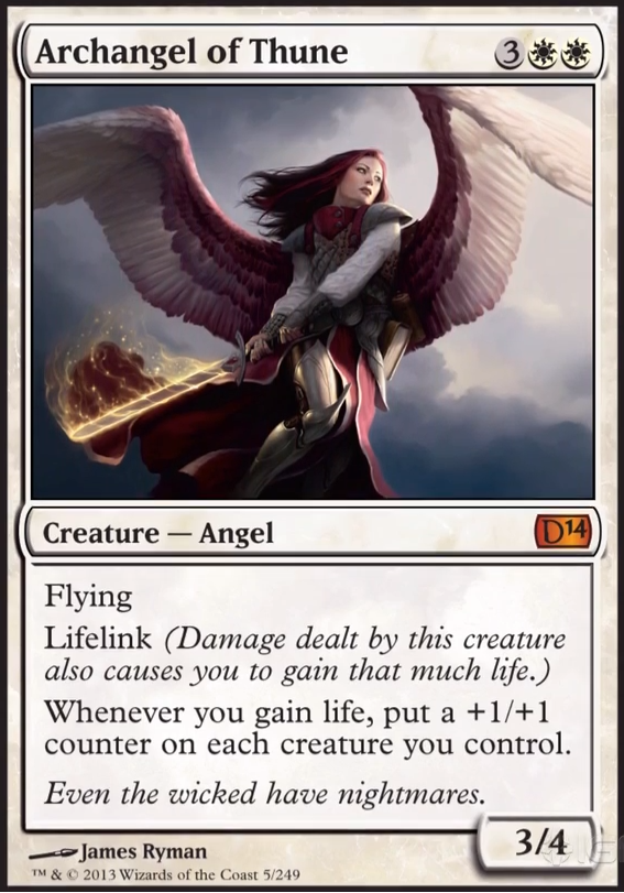The ultimate question is whether or not this Angel is as powerful as Baneslayer Angel. Let's see...power and toughness are both lower but the Arachangel of Thune has the power to pump your own creatures. It seems like a close call to me, but I am not sure if the Archangel of Thune can overcome the fact that she is only a 3/4 vs. a 5/5. Sure, she can gain you some life with lifelink and pump your dudes, but is that enough to become dominant? I thought Submlime Archangel was very strong and her influence in Standard was shortlived. This creature is an Angel and Mythic, so she won't ever become worthless. But I doubt she becomes the $50 card Baneslayer Angel once was.