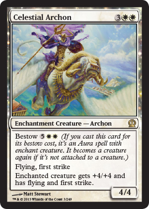 Whoa, another Enchantment Creature? I'm getting the feeling this format is going to become very confusing with all these game states. How many times a game will the number of mana symbols be counted for devotion? How many Bestow rules questions will be asked at each Prerelease? I shudder to think about this. In terms of value, isn't this card in an intro pack? Enough said.