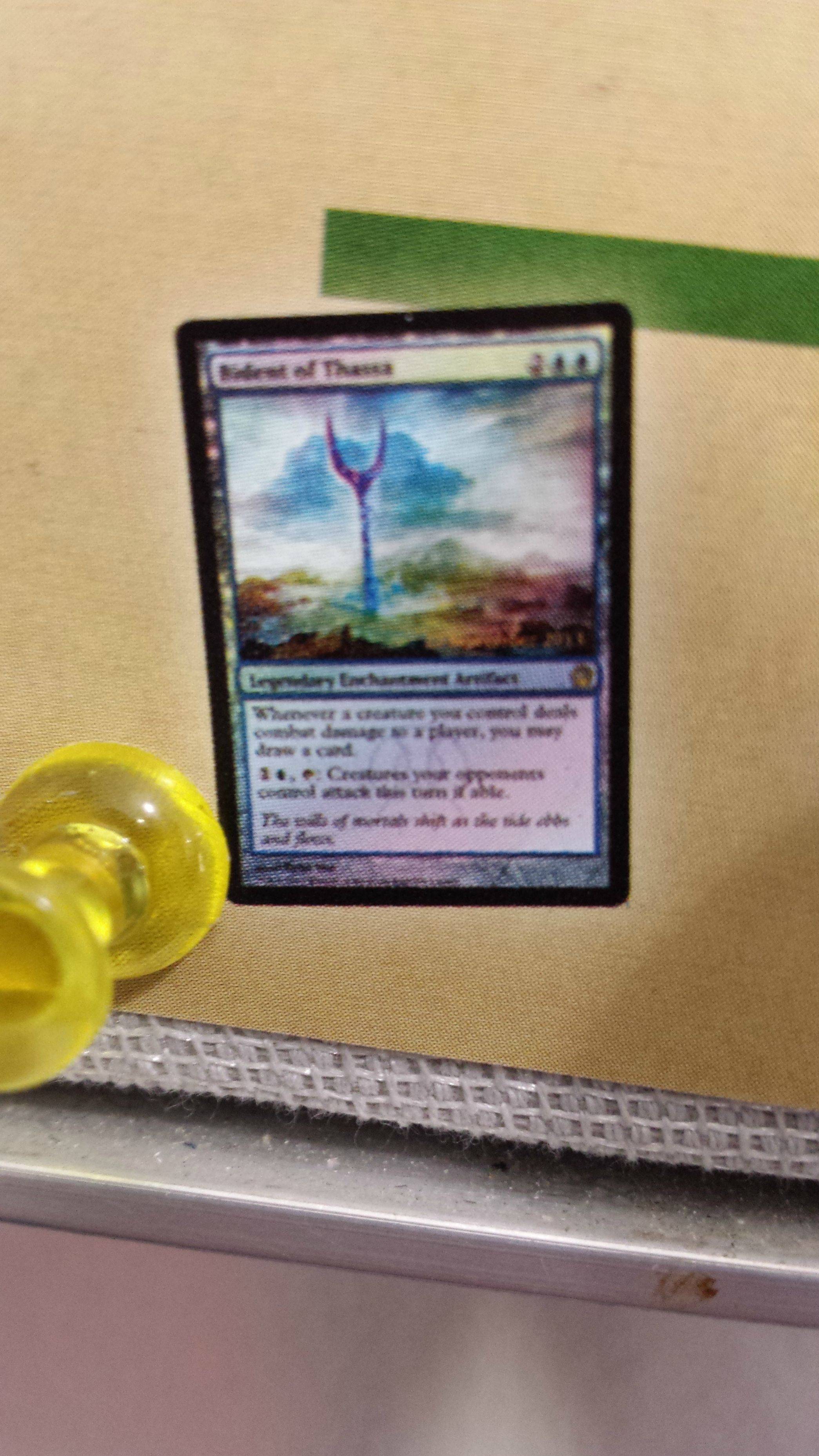 This is a first - enchantment artifacts. Tarmogoyf fans rejoice at the potential +2/+2 bonus! In all seriousness, this is an interesting card. It basically turns all your creatures into Scroll Thief and it has the cute ability to make your opponents creatures attack, allowing yours to get through. The flavor is there, the abilities are strong...I just don't know if I can get around the casting cost. 2UU is steep. Very steep. In Legacy, this card will never be played over Jace. Without seeing more Theros spoilers, I gotta say this isn't the card to play - usually blue control decks don't want to attack and don't have many creatures to attack with. Being a rare and what appears to be a promo, my interest finance-wise is near zero for now.