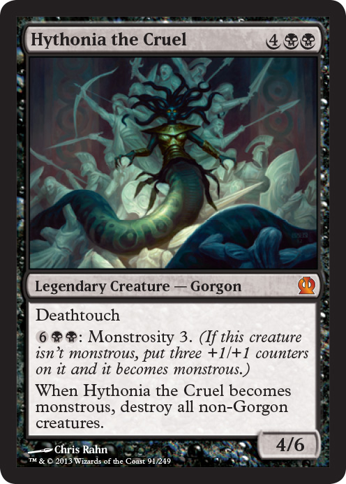 The only thing cruel about this card is Hythonia's parent's, who decided to name their offspring Hythonia. All joking aside, I'm not too impressed here. Comparing this creature to Grave Titan (same casting cost) makes me like this creature even less. 4/6 seems like a setback, and the 8 mana Monstrosity cost is almost insulting. Sure, she pretty much wipes the board when activated, and I suppose a really grindy control deck could get there one day. But 8 mana should be basically winning you the game...not making a big dumb creature that dies to all sorts of removal. I know the removal argument gets old, but honestly I'd rather just play Supreme Verdict and better creatures. Maybe that's just me.