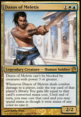 Daxos has the evasion Adept wanted and has the lifegain missing from Nightveil Specter's life, not to mention the ability to cast any card you have converted mana enough to pay for. I don't know how much play this will see, but if you can either bump his power and toughness a bit or clear some small dudes out of the way, this ability of his could get out of hand, quickly. It may sound like a lame answer, but there is really no way to fully evaluate the impact this card will have until we see the rest of the set. All I know is that this may be the best Ophidian ever printed, and control decks might even want to serve this. I like this card a lot, but that doesn't mean it's going to be good. But since when do cards have to be good to be worth money? Not when there are millions of casual players playing this game. I'm not pre-ordering, but I'm not disappointed if he's in my pre-release sealed pool, either.