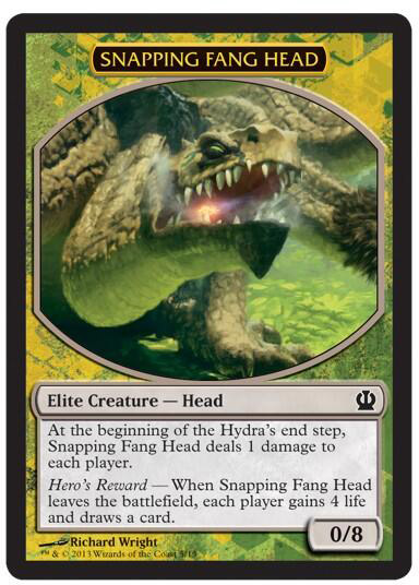 The color scheme on this token kind of reminds me of Eldrazi tokens. Except this guy is no mealy 0/1 do-nothing token. This "Elite Creature" is a 0/8 that pings all players each turn. We also see some kind of new mechanic, where each player is rewarded when this creature is killed. Called "Hero's Reward", I sure am curious to see how these cards will impact the game of Magic as we know it!